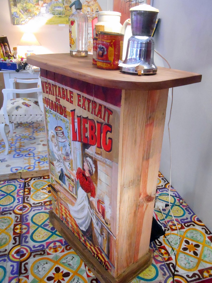 Petit comptoir publicitaire,, réalisé avec une palette de 120cm,lasure au vinaigre,décor peint